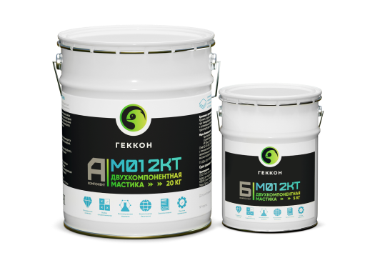 Геккон М01 2КТ - Двухкомпонентная полиуретановая мастика, с сухим остатком 100%. Используется для заполнения и надёжной гидроизоляции деформационных швов, сохраняет эластичность и адгезию к основанию в условиях широкого диапазона температур. Поставляется в виде комплекта: полиольная часть — компонент «А», отвердитель — компонент «В», дополнительно может поставляться тиксотропирующая добавка, для применения мастики в потолочных и вертикальных деформационных швах.